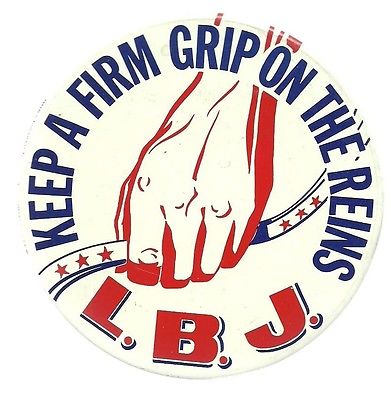 Title (ebay affiliate link): LBJ, LYNDON JOHNSON KEEP A FIRM GRIP ON THE REINS LARGER SIZE POLITICAL PIN