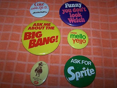 6 VINTAGE SODA & JUICE ADVERTISING BUTTONS/PINS-COKE, MELLO YELLOW, BIG BANG