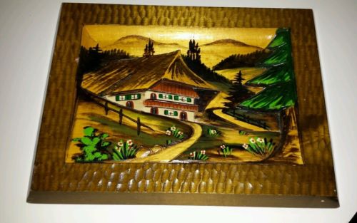 Vintage Black Forest Scene Germany Hand Painted Wood Frame Carving