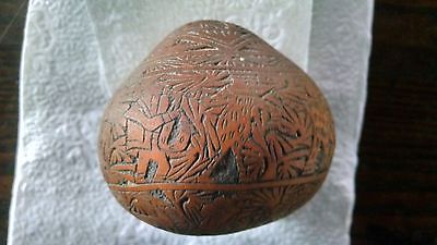 Carved primitive gourd/shell - Peru Musicians - Shaker - Intricate!