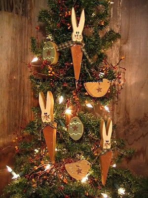 ~ 7 Primitive EASTER BUNNY Rabbit Carrot EGG CHICK Wood Ornies Ornaments