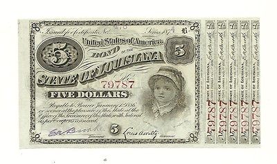 Title (ebay affiliate link): Post-Civil War $5.00 State of Louisiana "BABY BOND" 1870s