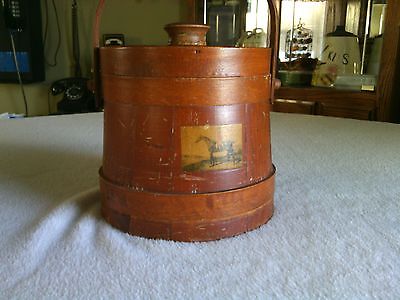 small antique primitive firkin bucket with lid and decal