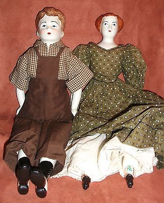 Old Vintage Primitive China Head Type Dolls Jon Martha Set Straw Stuffed ! set