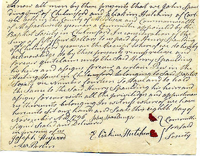 Title (ebay affiliate link): CHELMSFORD MASSACHUSETTS BAPTIST SOCIETY BILL OF SALE FOR MEETING HOUSE PEW 1796