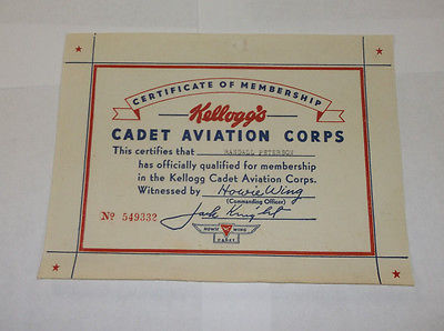 Title (ebay affiliate link): 1938/1939 Cadet Aviation Corps, Howie Long, Member Certificate, Kelloggs