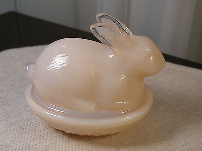 L. E. SMITH PINK MILK GLASS EASTER BUNNY RABBIT CANDY DISH W/LID BASKET WEAVE