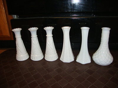 Title (ebay affiliate link): Lot of 6 Vintage White Milk Glass 6" Bud Vases Wedding Bridal Shower