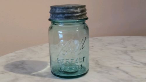 Antique Blue Glass Ball Perfect Mason Pint Size Jar With Zinc Milk Glass Lid