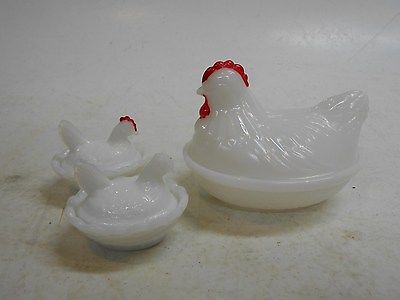 Three Vintage Milk Glass Anchor Hocking Hens on Nest