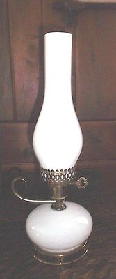 Title (ebay affiliate link): Vintage Milk glass/brass finger lamp, hurricane electric chimney
