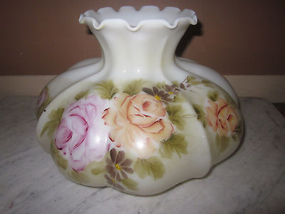 VINTAGE WHITE ROSE MILK GLASS SHADE HAND PAINTED HURRICANE FLORAL 10" WIDE 7"