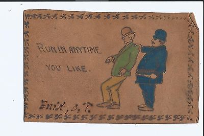 Vintage Leather Postcard "Run In Anytime You Like" Cop & Man Handpainted PM 1910
