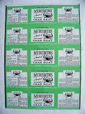 Vintage Meredith's CRAB MEAT Sample Uncut Sheet of 5 Tin Cans Frame-it! Maryland