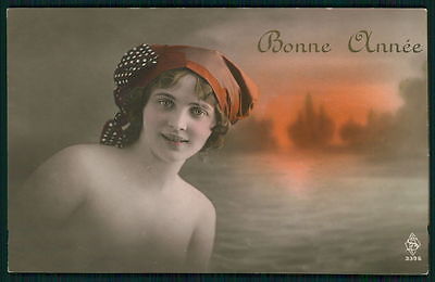 Edwardian romance 1910s original old photo postcard lady nude shoulders sea