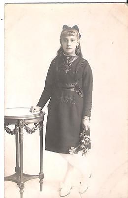 Title (ebay affiliate link): RPPC, postcard, little girl near French table holding flowers # 87-8