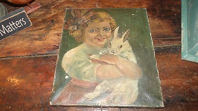 Antique Oil On Canvas Little Girl With Bunny Rabbit Extremely EARLY Piece Easter