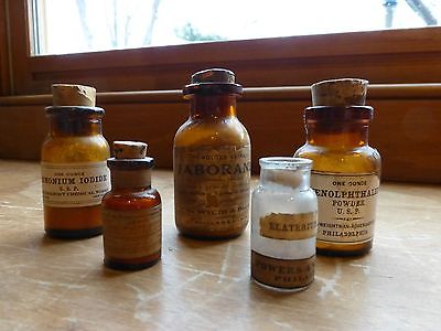 Title (ebay affiliate link): FIVE LABELED APOTHECARY PHARMACY DRUGGIST BOTTLES CORKERS
