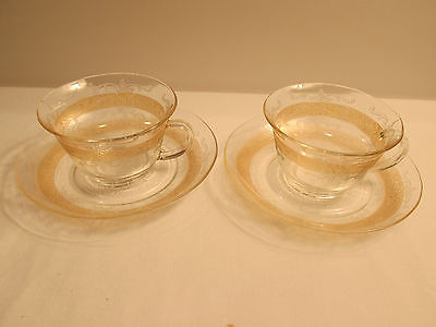 (2) MACBETH-EVANS S-PATTERN STIPPLED ROSE CRYSTAL W/AMBER BAND CUPS & SAUCERS
