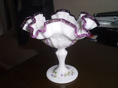 FENTON COMPOTE, MILK GLASS WITH PURPLE RUFFLE, HAND PAINTED AND SIGNED