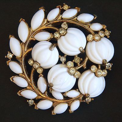Title (ebay affiliate link): Vintage Trifari white milk glass leaves and berries fruit rhinestones brooch pin
