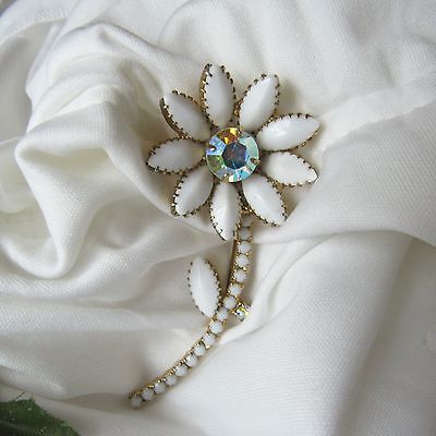 Title (ebay affiliate link): Vintage White Milk Glass Aurora Borealis Rhinestone Stem Flower Brooch Pin