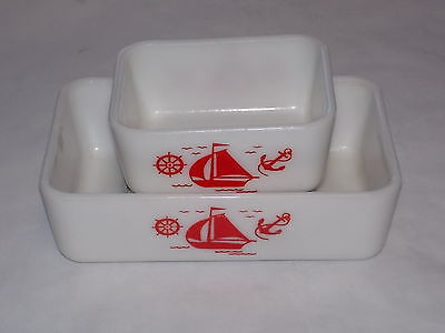 Two vintage McKee Milk Glass Refrigerator Dishes - SAILBOAT motif'