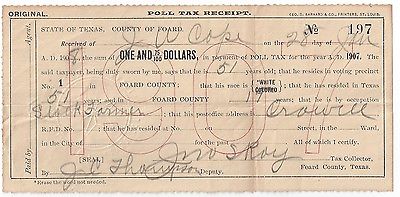 Title (ebay affiliate link): 1907 Poll Tax Receipt Foard County Texas "White" "Colored" Race Noted - Scarce