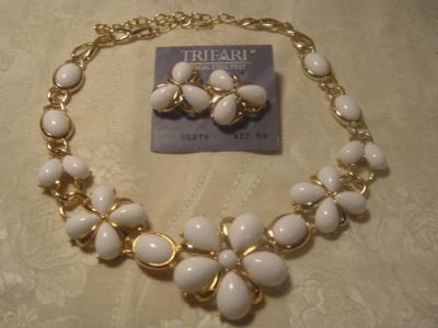 Vtg Trifari Milk Glass Necklace & Pierce Earring Set