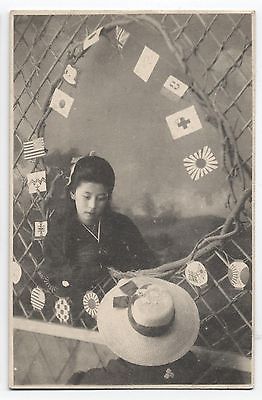 JAPAN ~ Woman inside Stick/Vine Net with Flags c1930's Woman with Hat
