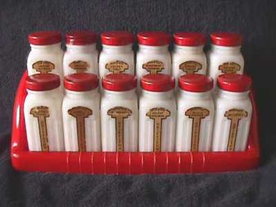 Vintage Griffiths' Milk Glass Spice Jars with Red Rack