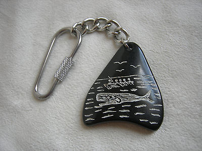 Title (ebay affiliate link): vtg alaskan scrimshaw keychain - whaling scene - white cuts on black surface