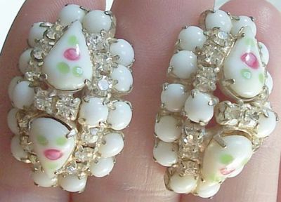 VINTAGE SCREW on MILK GLASS & RHINESTONE EARRINGS