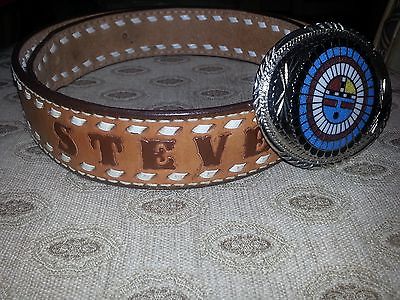 VTG.SIGNED BELT & BUCKLE W/INLAID STONES native American Water,Earth,Wind &Fire