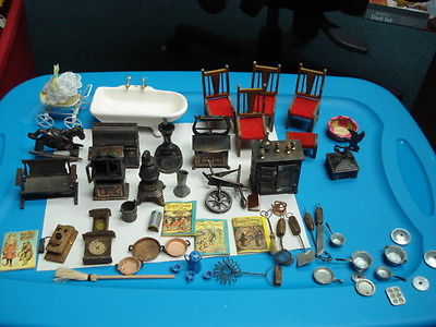 ANTIQUE VINTAGE DOLL HOUSE FURNITURE LOT VICTORIAN BRASS WOOD METAL BOOKS