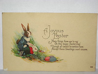 1910 POSTCARD JOYOUS EASTER, RABBITS CLOTHES WITH COLORED EGGS