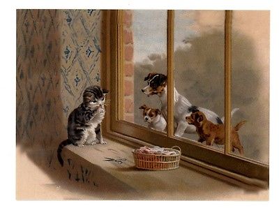 modern cat postcard Maguire tabby cat inside watches JRT terrier dogs outside