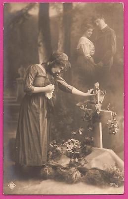 Lady Widow Grave Couple Love Romance 1910s Original Vintage Old Photo Postcard