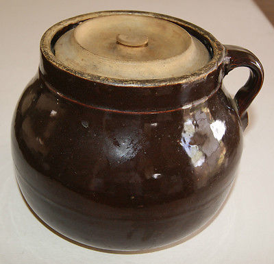 Early Antique Stoneware Dark Brown Glaze Handle Crock with Lid