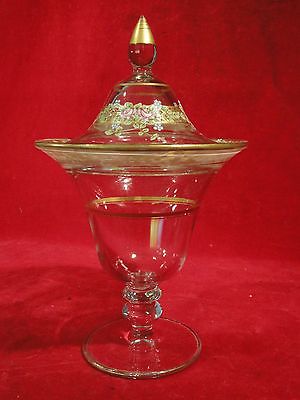 RARE ANTIQUE ORNATE RAISED PATTERN HAND PAINTED CANDY VASE WITH PAINTED LID