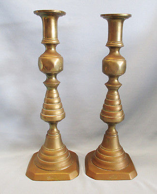 Antique Brass Bee Hive Push Up Candlesticks, 10 3/4 inches. date to 1893