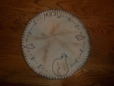 Primitive Handmade Stitchery Candle Mat Cat Meow Wool Backing