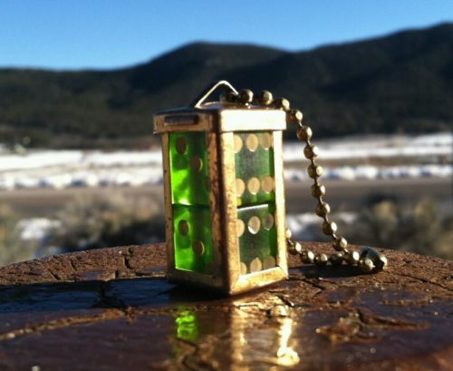 Title (ebay affiliate link): Vintage mini Green Translucent Dice in Brass Cage Keychain