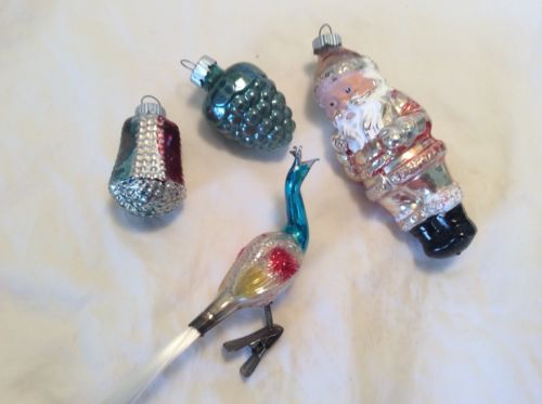 Title (ebay affiliate link): FOUR VINTAGE GLASS CHRISTMAS SHINY BRITE FIGURAL SANTA BIRD ORNAMENTS