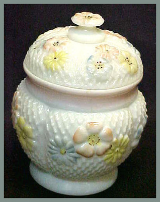 Cosmos Sugar Bowl w Lid Milk Glass w Color c1900