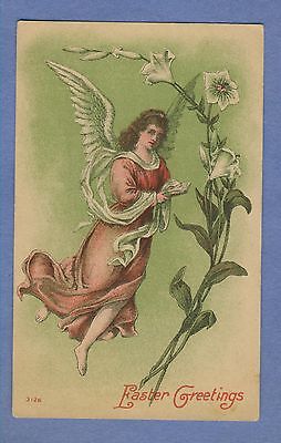 Vintage PC: Angel in Red Gown against Green Backdrop w/ Bible Easter Lilies