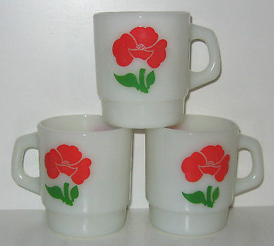 Title (ebay affiliate link): Three vintage milk glass fireking mugs / coffee cups with red flowers