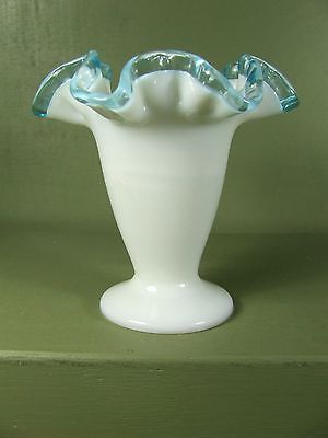 FENTON MILK GLASS RUFFLE EDGE VASE, BLUE EDGES