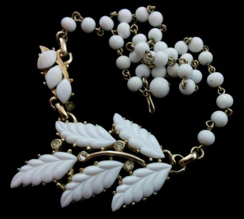 Title (ebay affiliate link): Sign KRAMER ? Vintage Necklace Carve Lucite Leaf Milk Glass Bead Rhinestone 1045