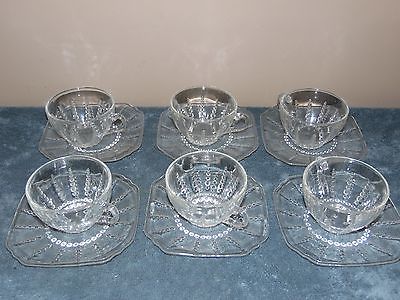 Set Of 6 COLUMBIA Bead Pattern Old Vintage Federal Glass CUP & SAUCER Depression